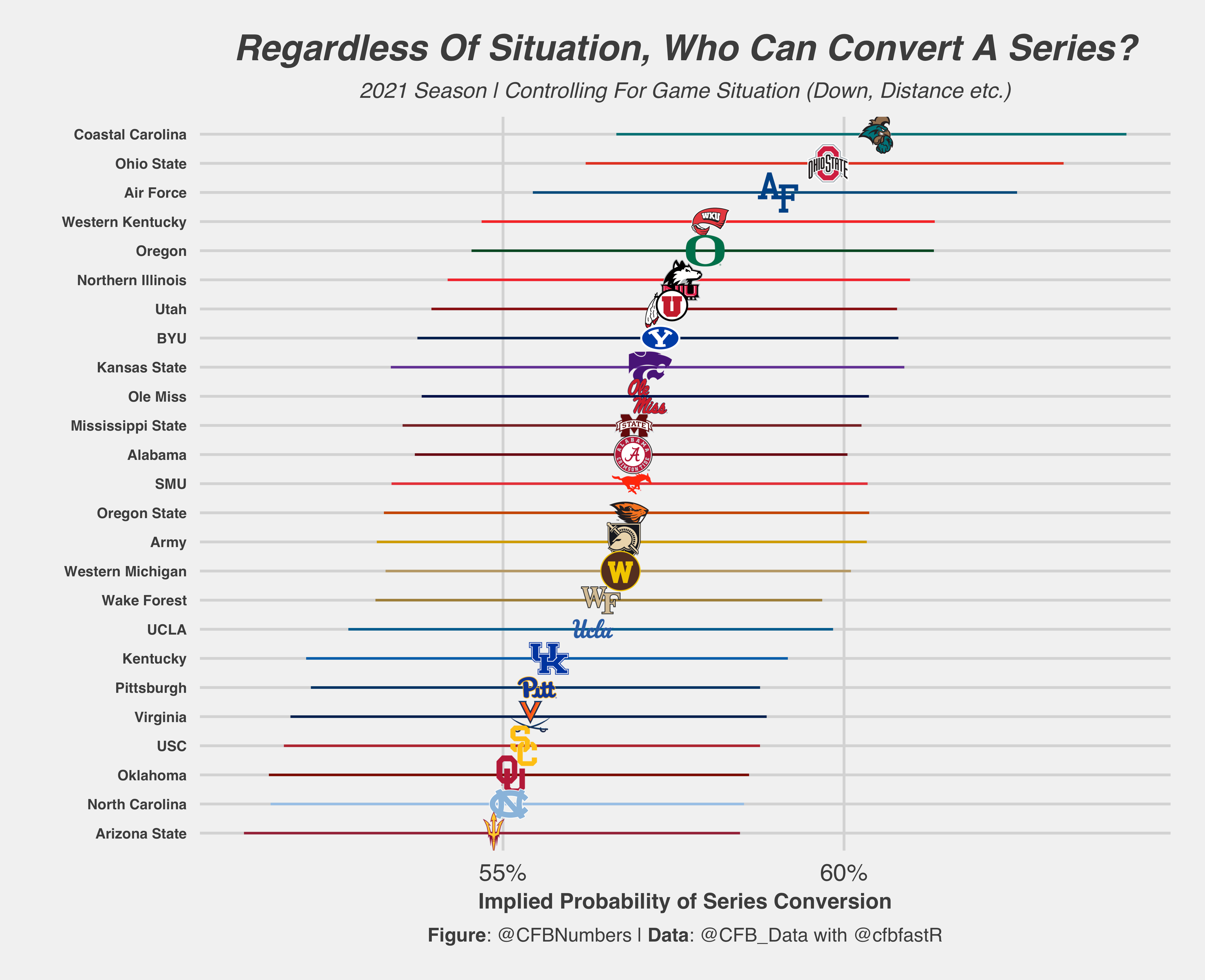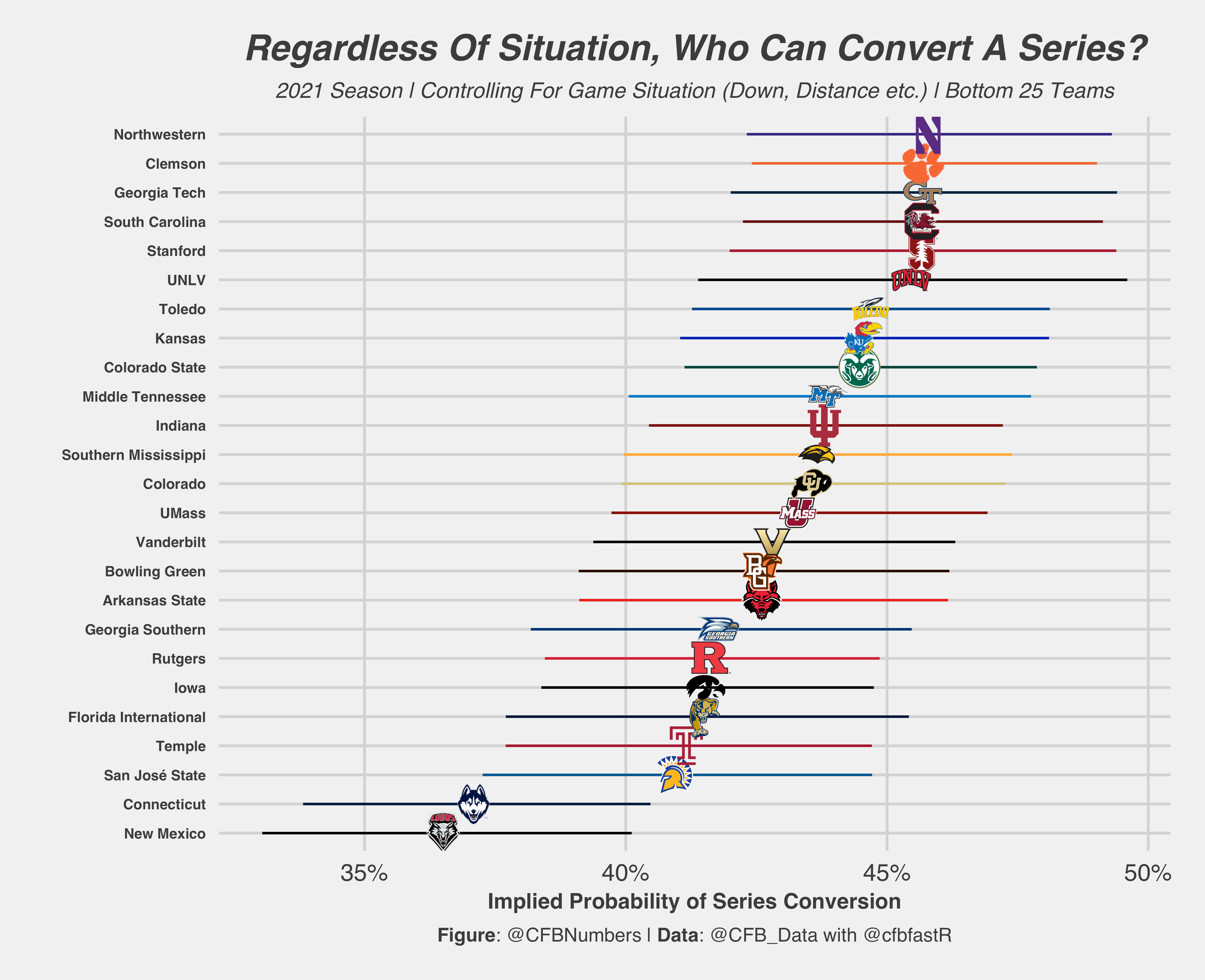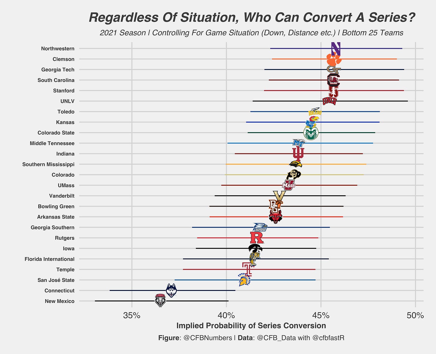 This is what the bottom 25 looked like for the 2021 season. You will notice that the Clemson Tigers were among one of the worst offenses at converting a series. Considering they still won double digit games, it is astonishing how much their defense carried the team. One would think if they had even a league average rate they may have made the playoff or even had a rematch with Georgia in the National Championship.