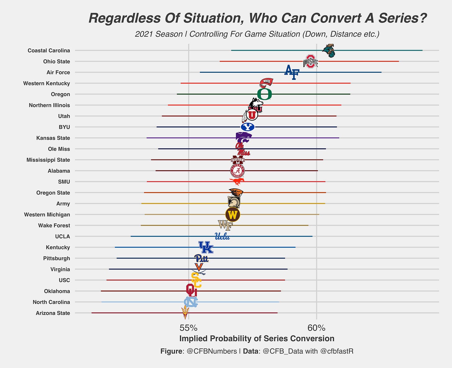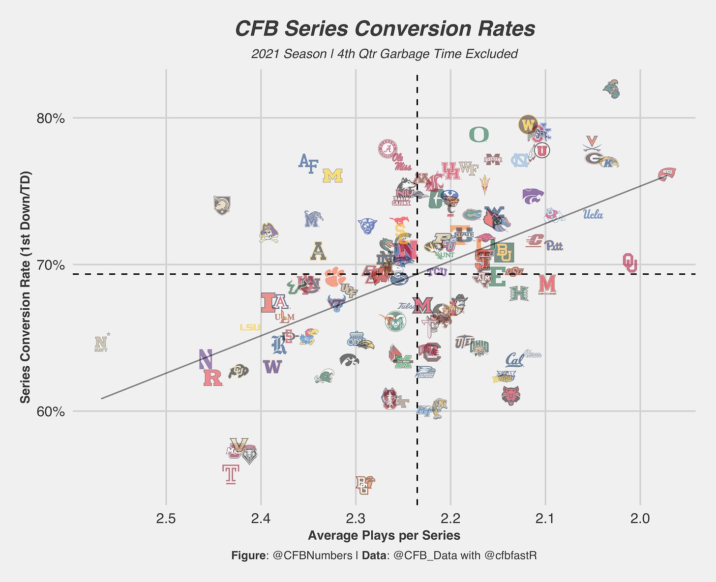 Here is how each team stacked up in terms of Series Conversion Rate in 2021. Pairing it with average plays per series, we can see which teams took more or less plays to convert a series, which is another way to look at an offenses explosiveness. As usual, the explosively efficient Coastal Carolina Chanticleers take home the crown for top SCR.