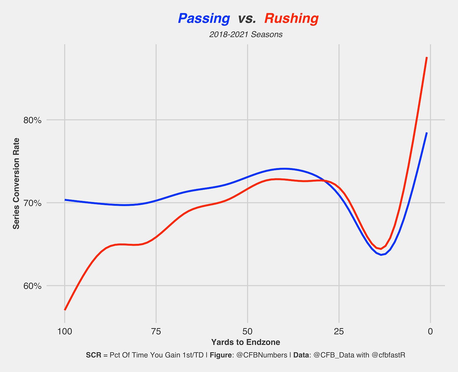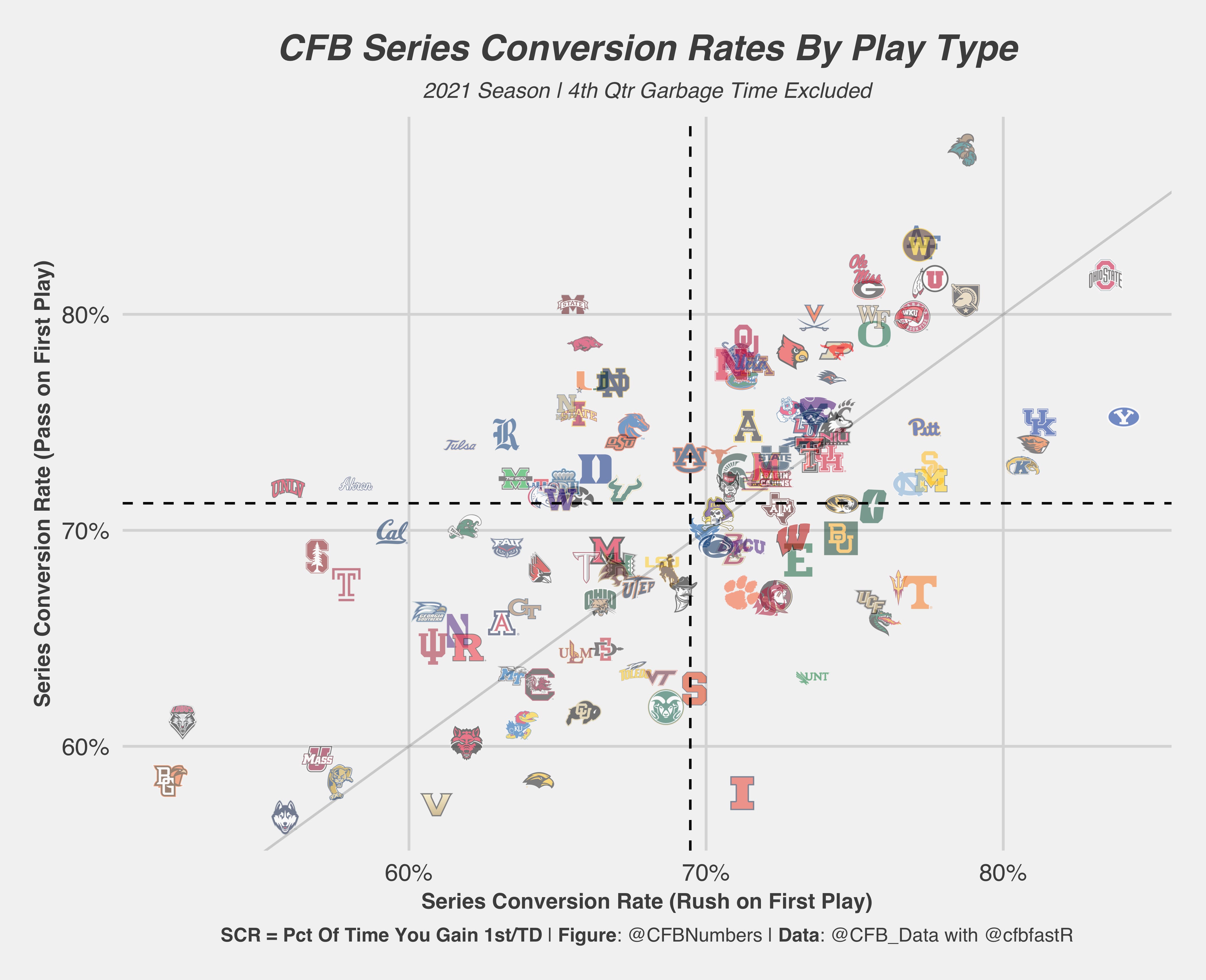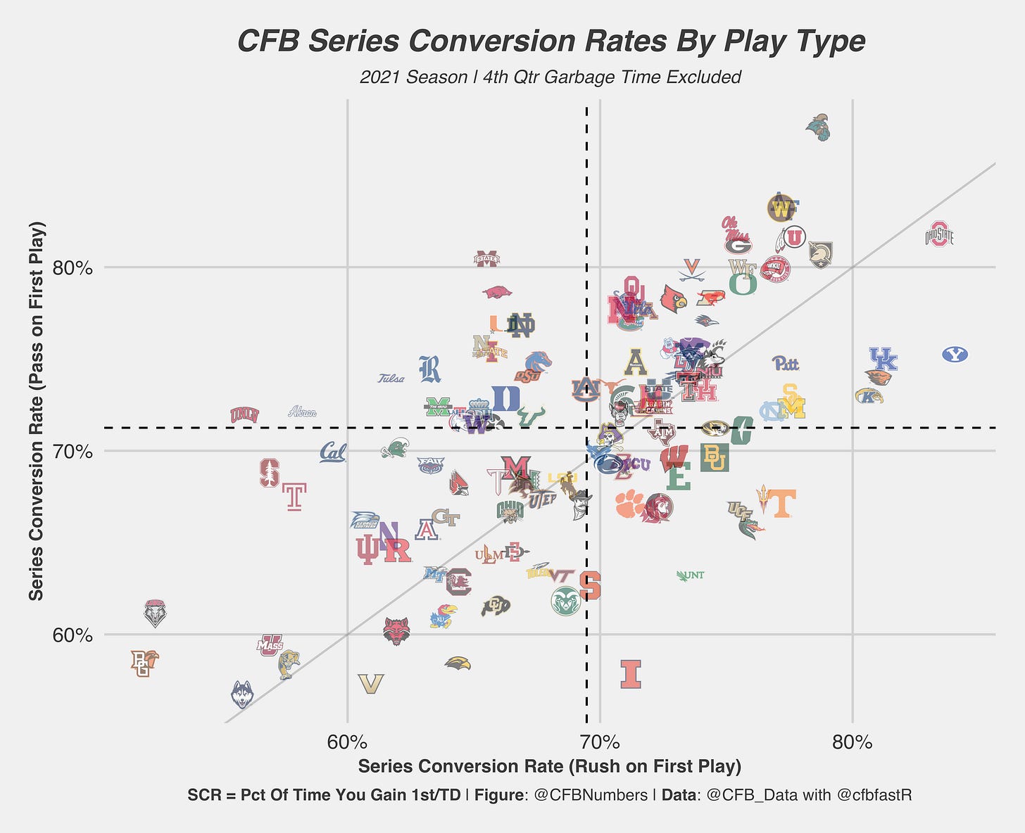 There are a myriad of metrics designed to evaluate an offense in college football. This isn’t a problem, its merely just information presented in different ways in order to get as many angles as we can. Some metrics focus on a game level (yards per game, total EPA, etc.) while others are at a more granular per play basis (EPA/Play, QBR or PFF Grades for players). Today, we’re going to go somewhere in the middle and look at the per series level in the form of Series Conversion Rate.