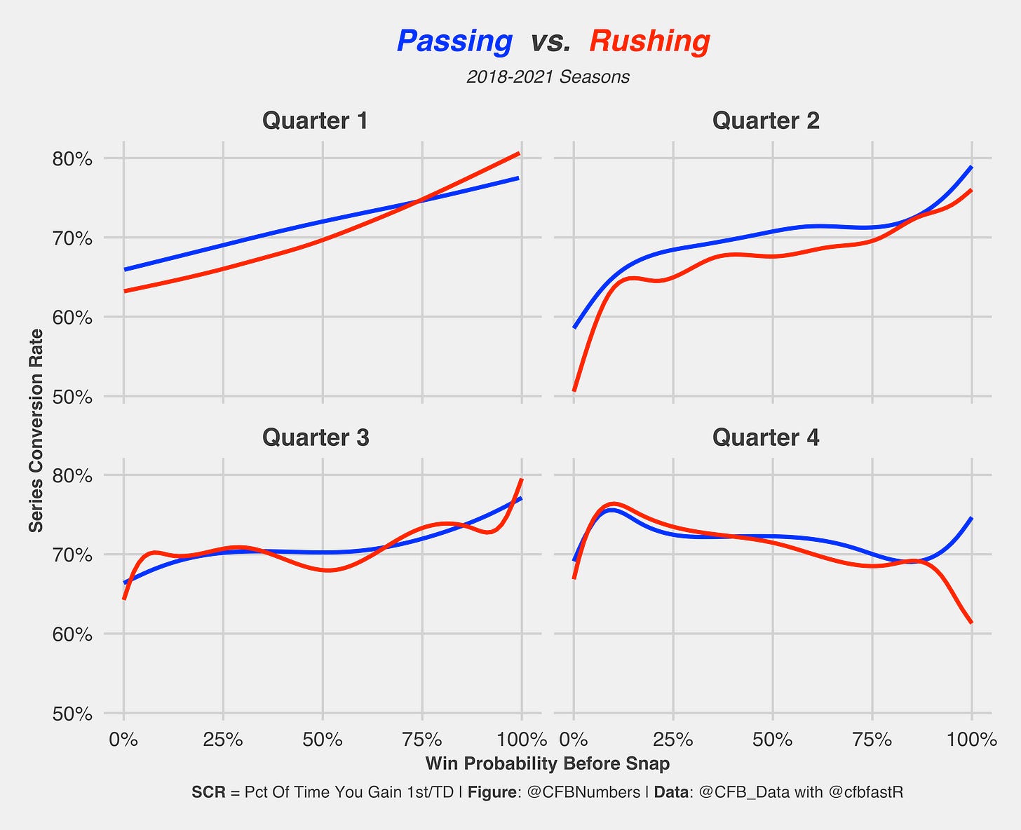 What about when the game is in hand vs. looking to comeback? We can look divide SCR rates by quarters to get a look into play types and win probability at different points in the game. In the first half if you already have a win probability higher than ~75%, pretty much either passing or running is going to work for you (Which, duh the game is already over). I did find it interesting that in the second half the series conversion rates are virtually the same for pass first and rush first regards of the win probability before the snap. You also start to see a bit of a downward trend in the 4th quarter, as teams with low odds to win start to get more riskier and take more shots to try and get back into the game.