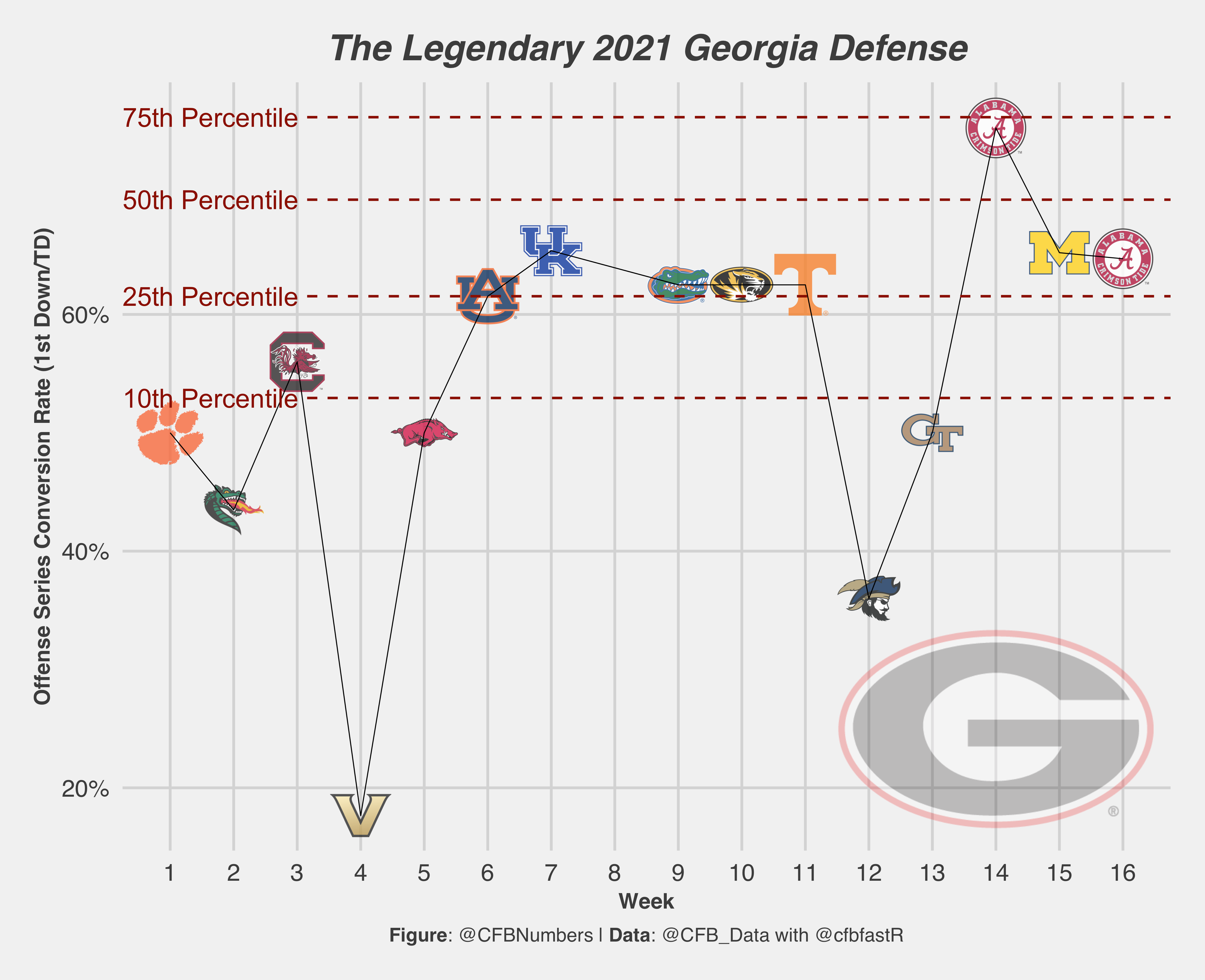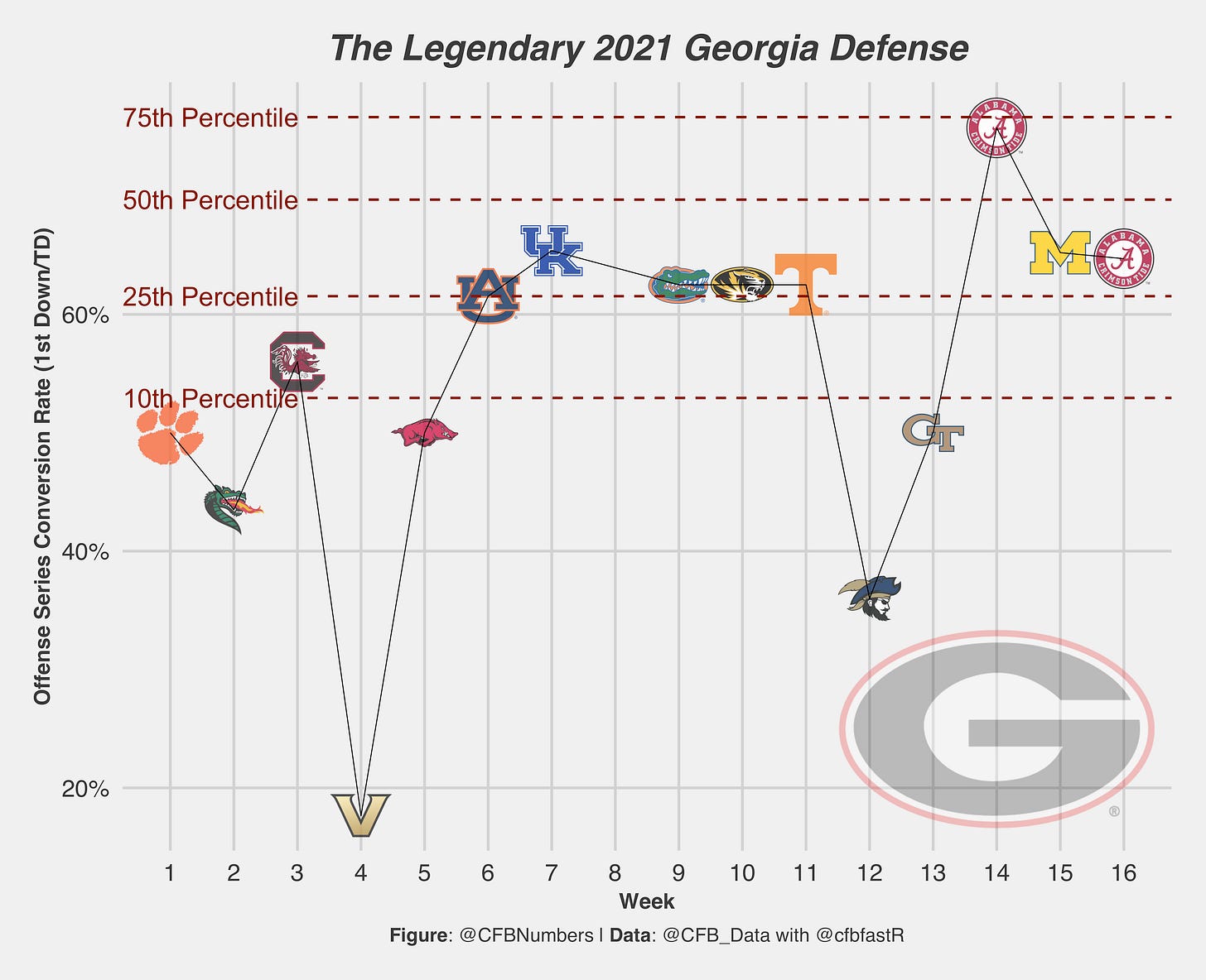 Im sure those outside of Athens may not want another metric showing off the dominance of Georgia, but I had to look for myself. Six of the Bulldogs opponents were held to series conversion rates in the bottom 10th percentile of all offenses. Outside of their lone loss in the SEC championship game, their defense held all opponents under the 50th percentile. This defense should be talked about as one of the best the sport has ever seen.